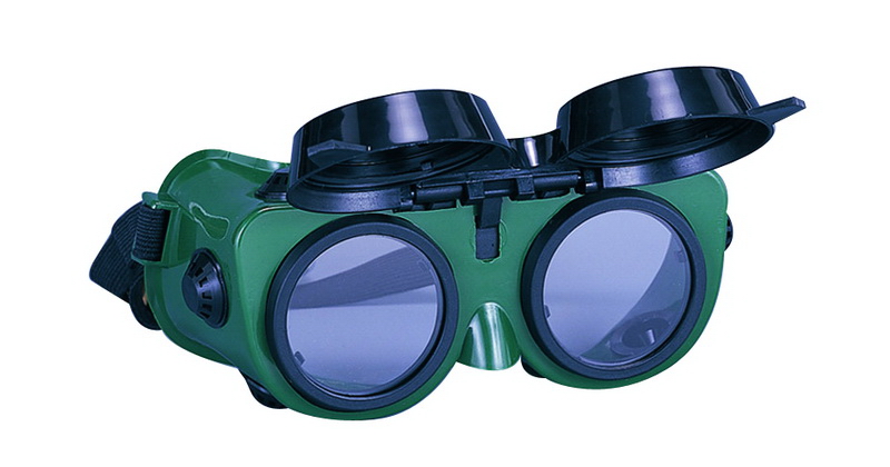 软质不透光绿色镜框,可掀式ABS塑钢镜架6个黑色透气钮,后由松紧带固定,戴近视眼镜者亦可适用,镜片有3层,内外层为PC透明镜片1.5x5Omm,中层为2.0x5Omm绿色镜片。